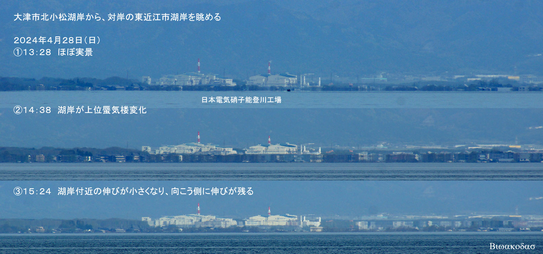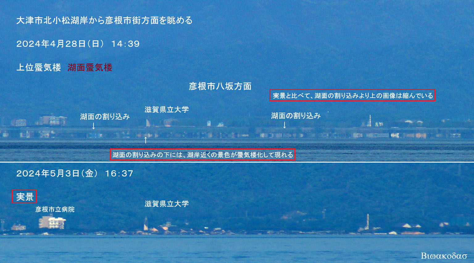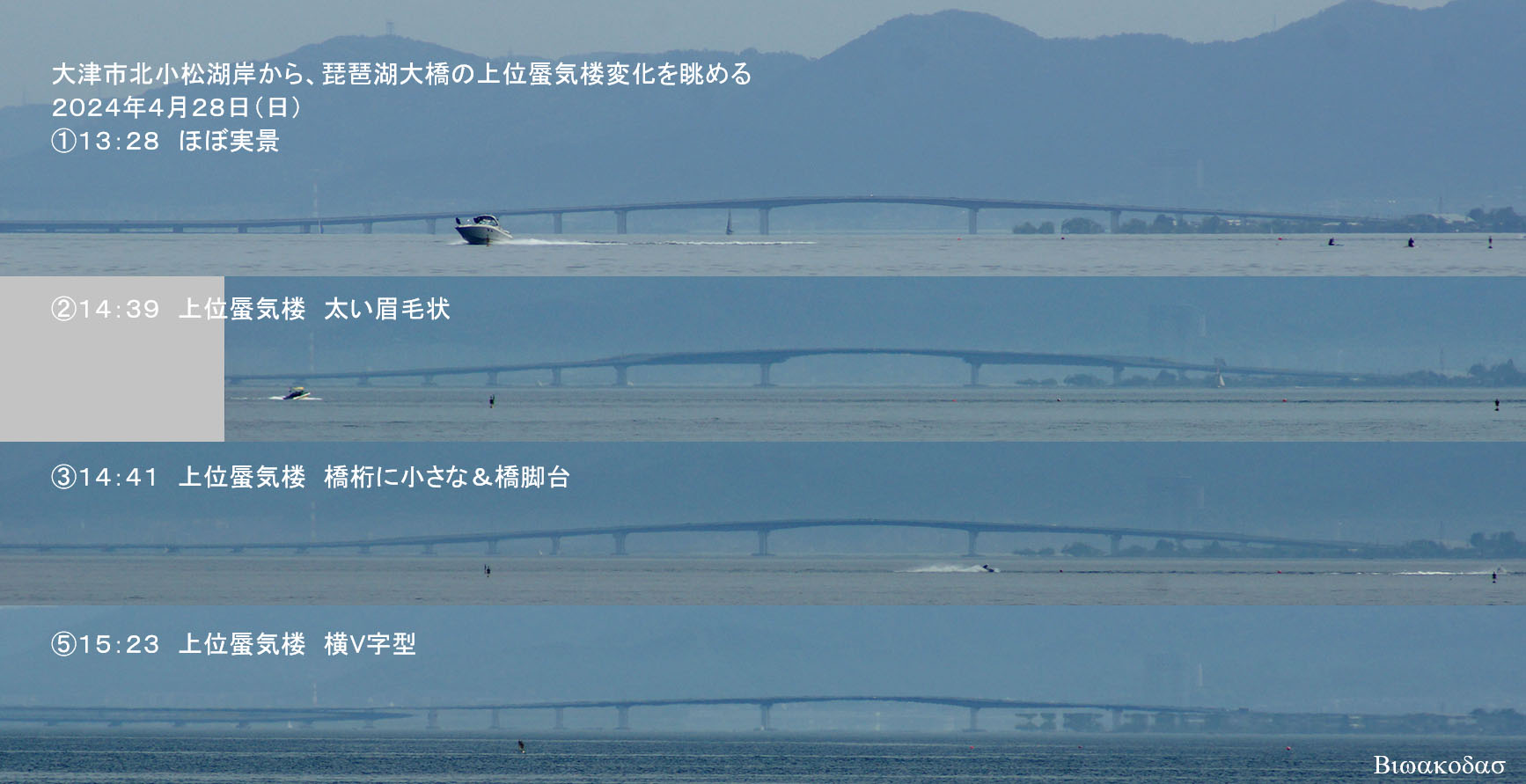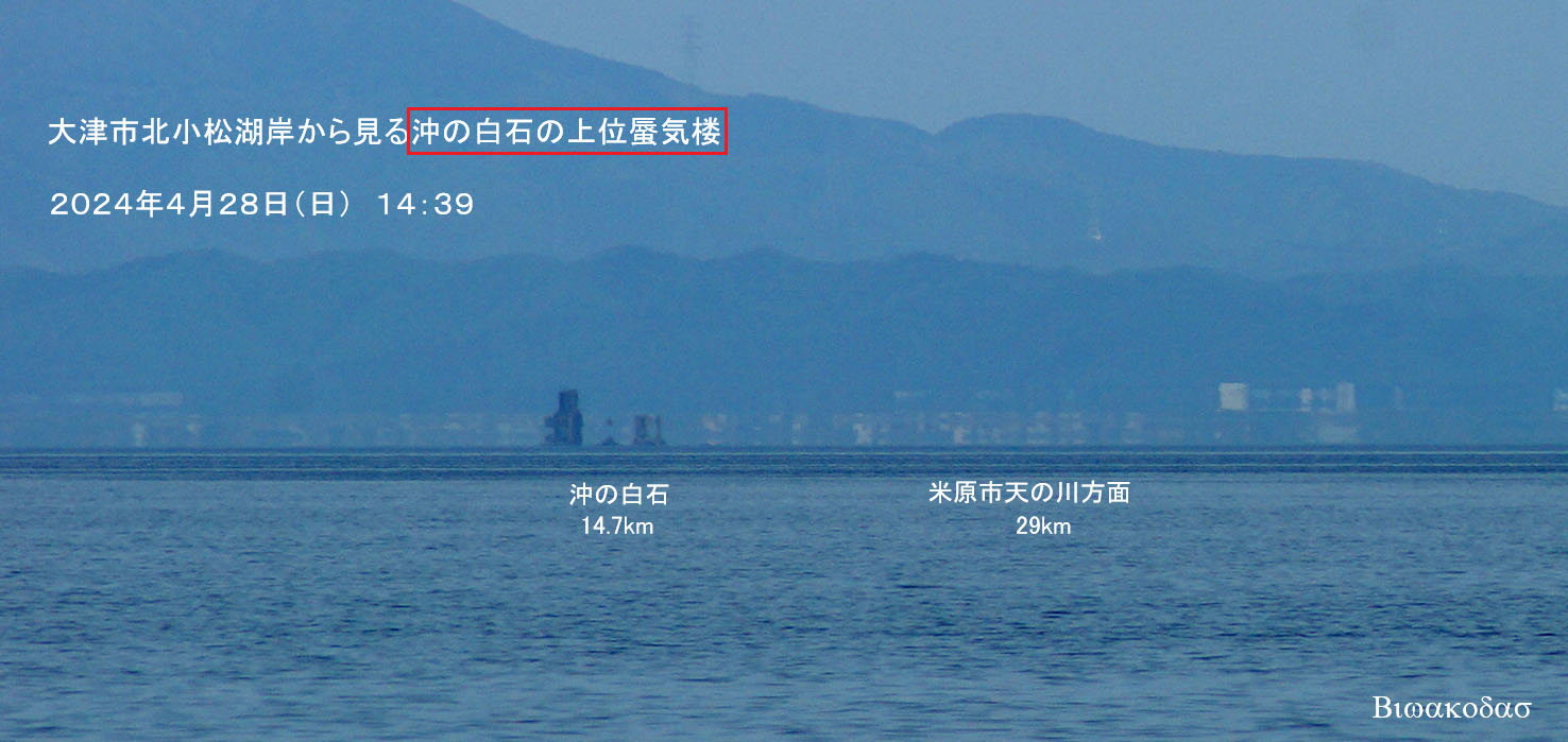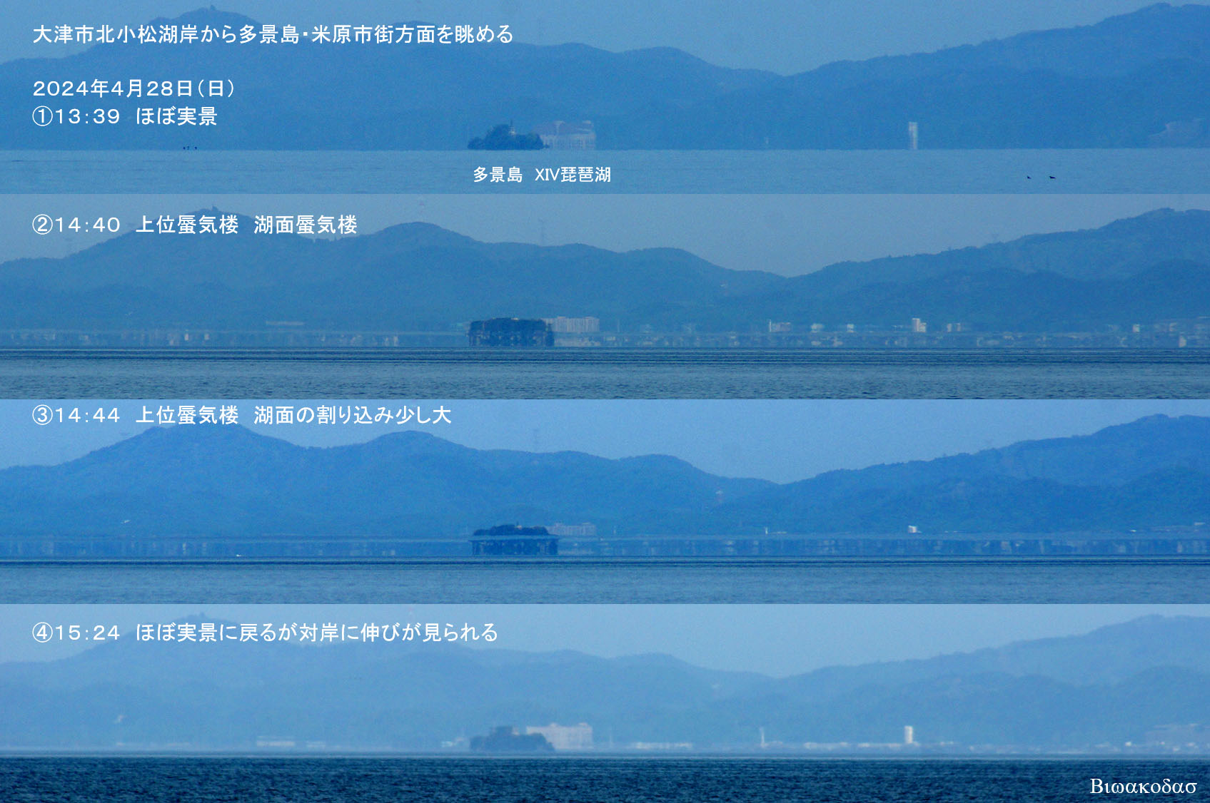 午後に大津市北小松湖岸から対岸や琵琶湖大橋を眺めると上位蜃気楼変化が確認できた。