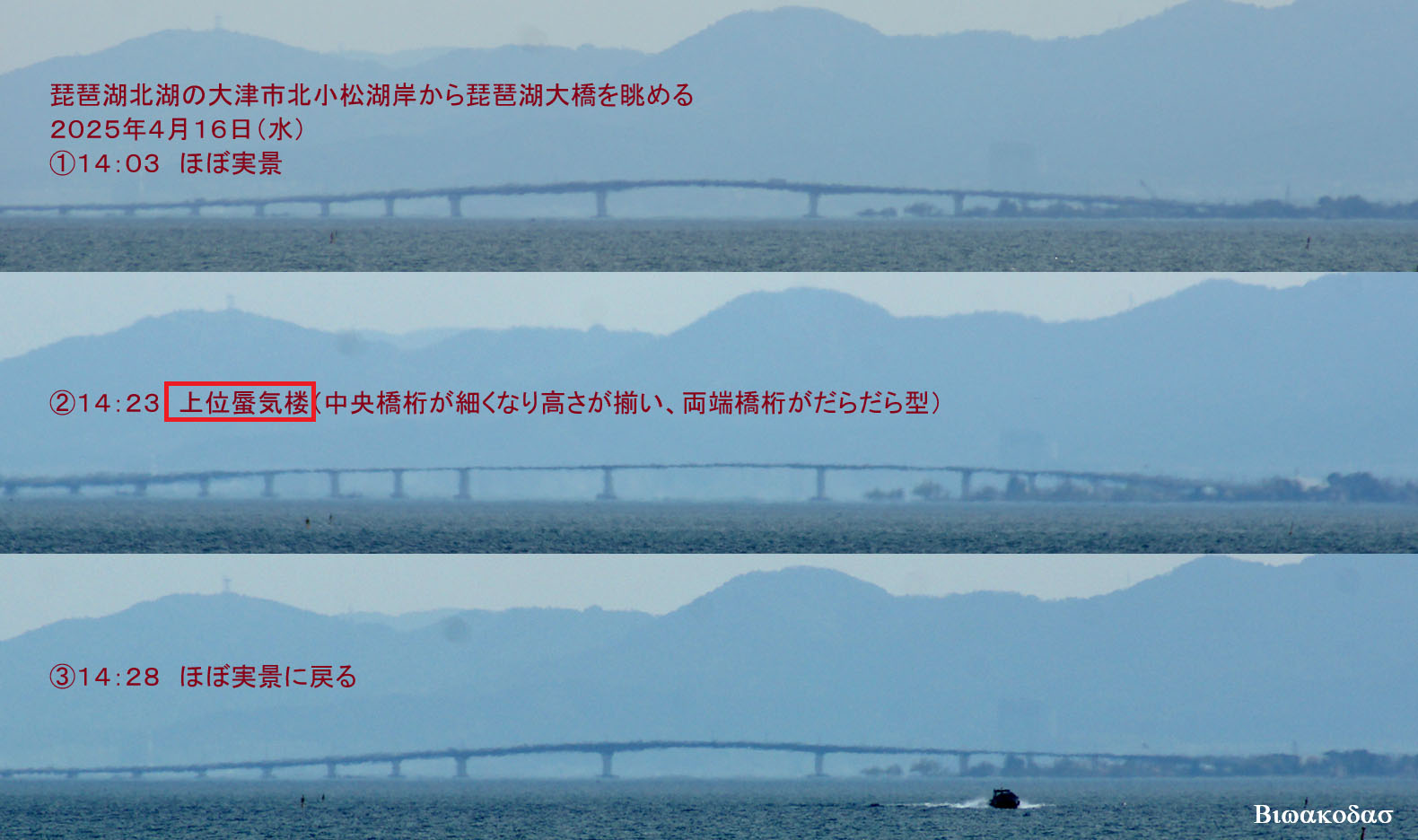 午後2時頃に大津市北小松から眺める琵琶湖は概ね実景であったが、琵琶湖大橋に小さな上位蜃気楼変化があった。