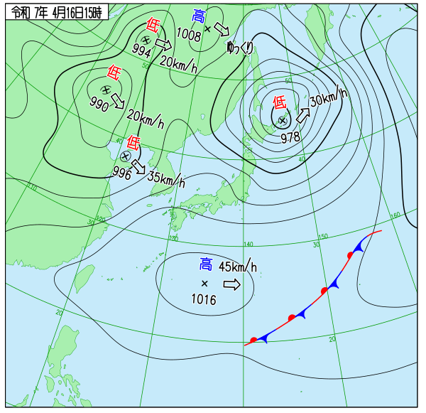 2025年04月16日(水)は、南海上に高気圧、日本海に低気圧の気圧配置で天気は良くなったが、琵琶湖においては午前中は強い西風が吹いた。