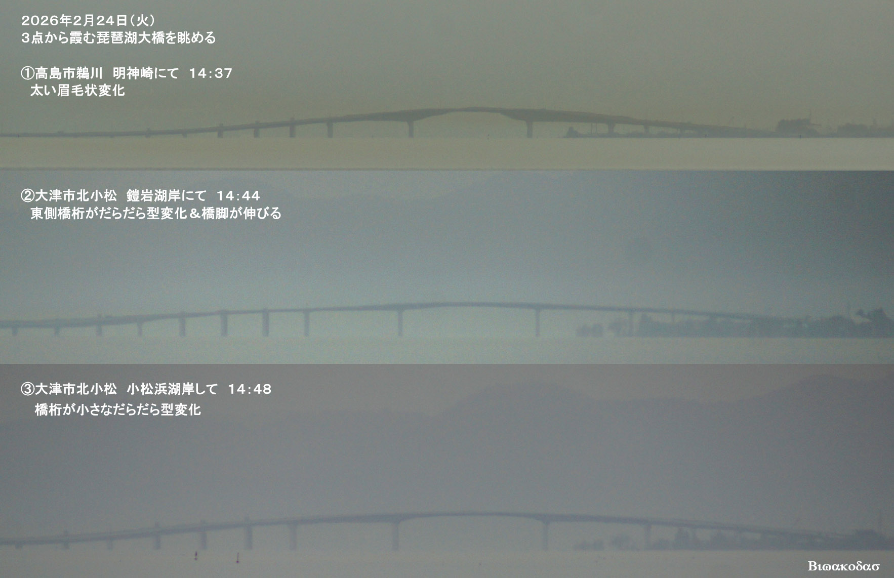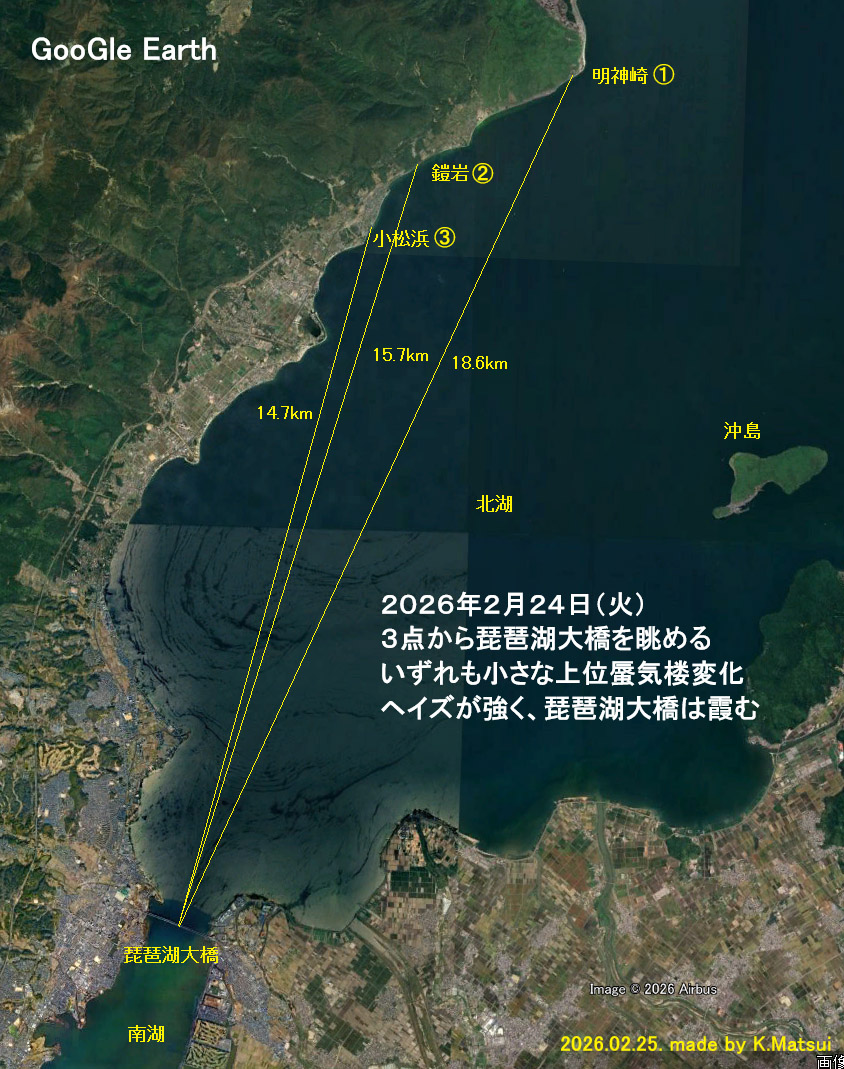 明神崎からの琵琶湖大橋は太い眉毛状、鎧岩や小松浜からは橋桁の太くなる変化が確認できた。北湖での上位蜃気楼観察の第1号となった。