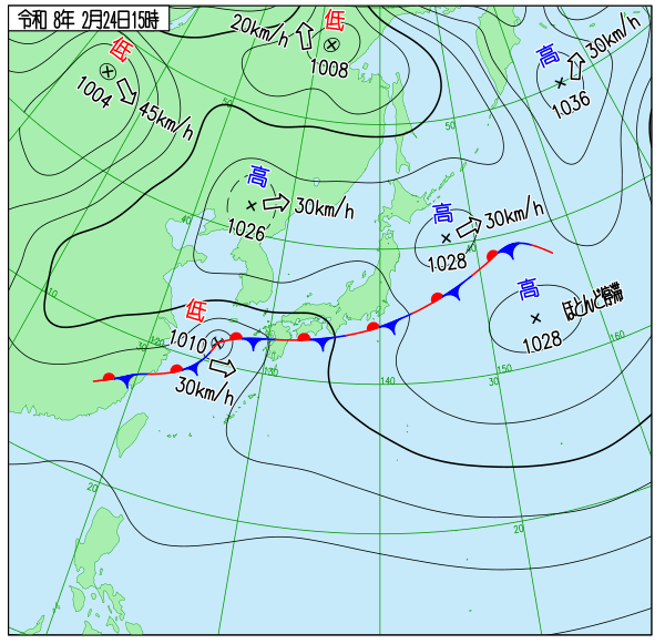 南岸の東西に長く前線が停滞するが