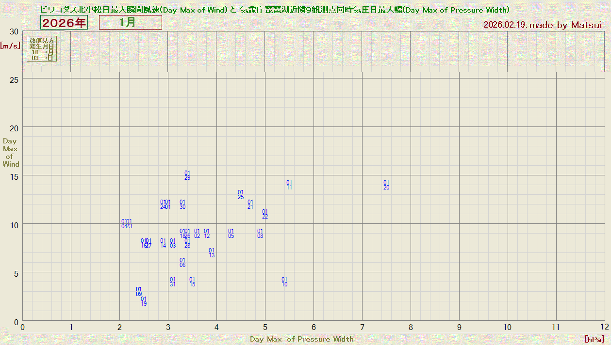 琵琶湖近隣気象庁9観測点の日最大気圧差(DayMax_of_PressureWidh)とビワコダス北小松日最大瞬間風速(DayMax_of_Wind)の関係をグラフ化したものです。日最大気圧差(DayMax_of_PressureWidh)は気圧傾度の目安であり、北小松での最大瞬間風速(DayMax_of_Wind)との相関を与えるものです。